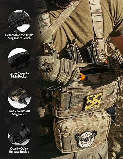 [Multifunctional Pockets]Chest rigs tactical main chassis fit 3 5.56mm Magazine on two 7.62mm AK Magazines. The triple mag insert is made using elastic, giving you quick and easy access to your mag while maintaining excellent retention. Laser-cut MOLLE straps on big main bag and shoulders for equipping more Tactical Gears make it a stand-alone system with maximum equipment storage. A detachable bottom pouch for other tools like, medical bag.