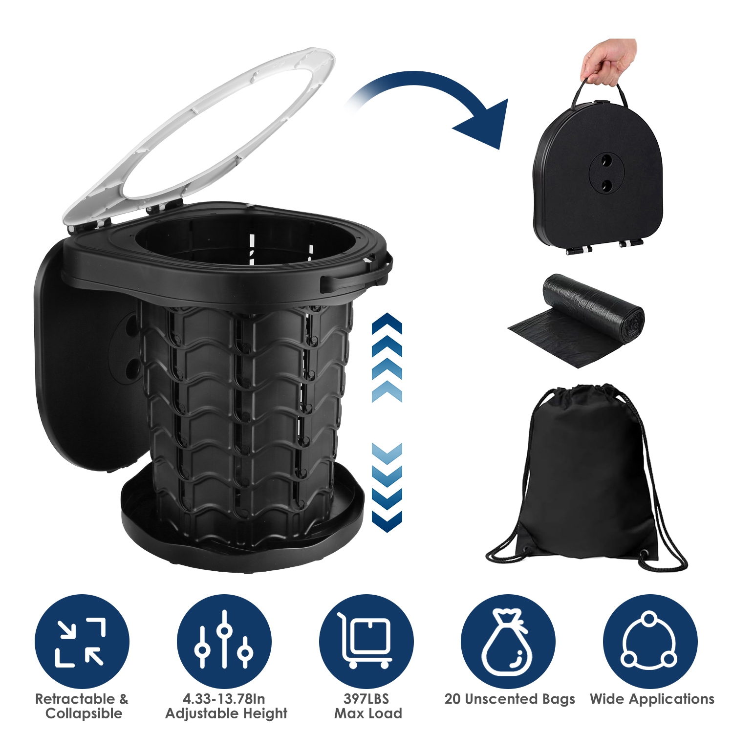 Home > Retractable Portable Toilet Collapsible Portable Potty for Adults Emergency Toilet Kit with Adjustable Height Lid 20 Garage Bags Carry Bag for Camping